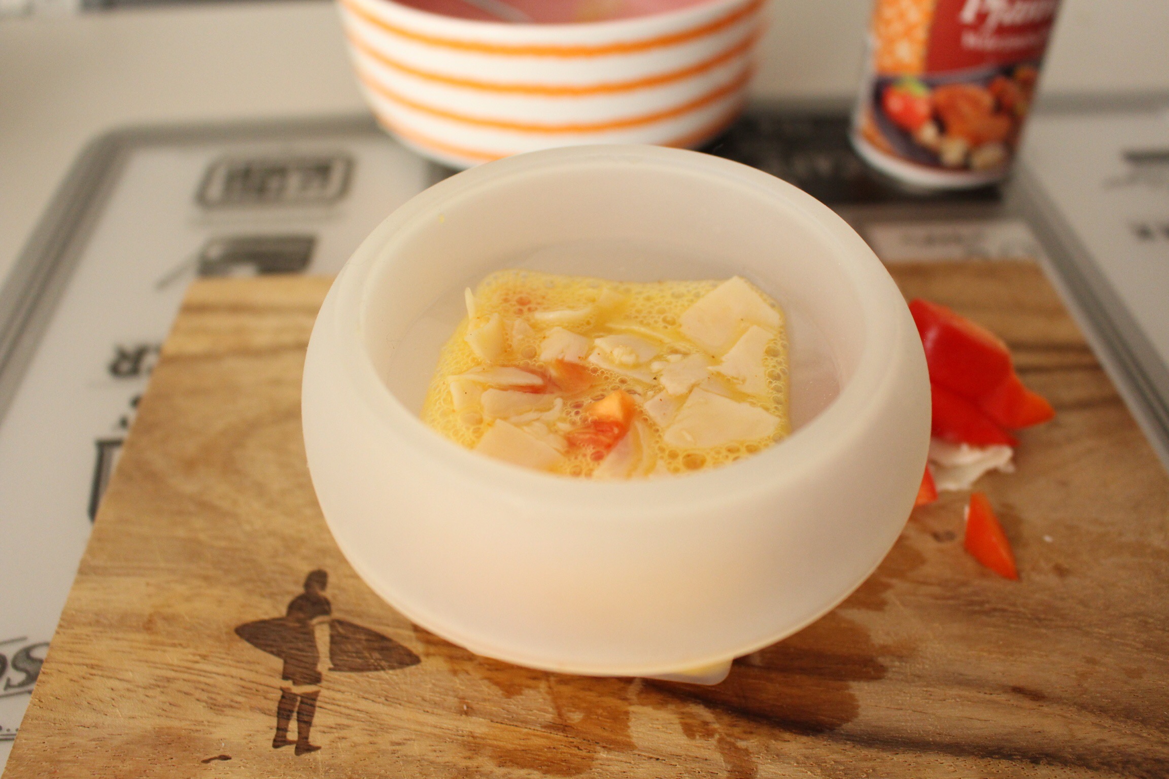 Entscheidend für diese Low Carb Frühstücksvariante ist das spezielle Silikonförmchen für die Mikrowelle. Ich hatte mir vor einigen Monaten 2 von Tchibo zugelegt. Eine ähnliche Form findet ihr aktuell auch auf Ebay. Für den Ei-Muffin schneidet ihr alles klein und gebt es zusammen mit dem Ei in die Form. Dann verrührt ihr alles und stellt es in die Mikrowelle. Für die Füllung der Form sind eurer Geschmacks-Fantasie keine Grenzen gesetzt – Zwiebeln, Pilze, Tomate,…