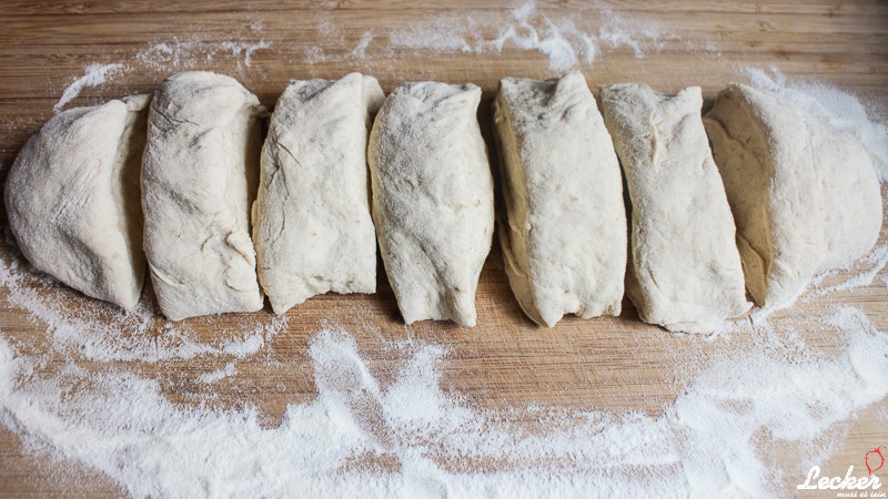 Arbeitsfläche eventuell nochmals leicht bemehlen und den Teig zu einer Rolle formen, in 7-8 Stücke schneiden und diese zu Brötchen schleifen.