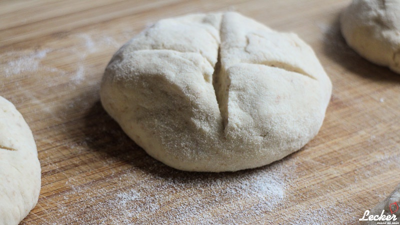 - Aus dem Teig ca. 12 kleine Kugeln formen, auf ein mit Backpapier ausgelegtes Rost legen und etwas flach drücken. Mit einem Messer kreuzweise einschneiden. Tipp: Zwischen den Teiglingen genügend Platz lassen, weil der Teig im Ofen noch etwas aufgeht.