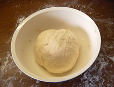 - Aus allen Zutaten einen Hefeteig kneten, den Teig in eine Schüssel geben, mit Mehl bestäuben, ein Kreuz auf die Oberfläche einschneiden, mit einem Tuch abdecken und an einem warmen, zugfreien Ort eine Stunde gehen lassen.