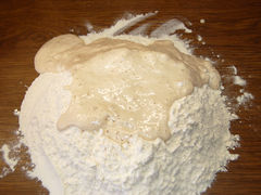 die aufgelöste Hefe in eine Kuhle im Mehl geben und zu einem elastischen Teig verkneten.